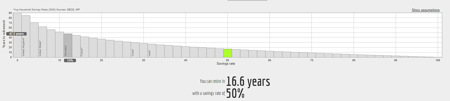 Si consigues una tasa de ahorro del 50%, que no es poco pero es bastante viable, podrás retirarte en 16 años aprox.