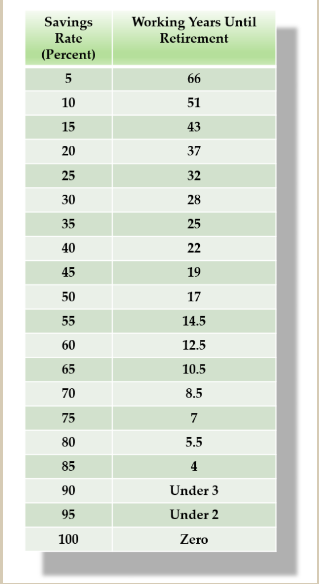 Te dejo un tabla que muestra cuantos años tendrás que trabajar partiendo de 0 según tu tasa de ahorro: